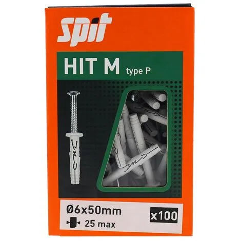 Les chevilles à frapper nylon HIT-M P de la marque Spit s’utilisent sur tous les matériaux. Leurs conceptions uniques garantissent l’installation parfaite de la cheville. Les chevilles Spit HIT-M P sont dotées de filetage de vis exclusif pour une installation et un démontage facile. Les douilles plates favorisent le placage parfait de la pièce à fixer. De plus, elles s’expansent seulement lorsqu’elles sont totalement insérées.