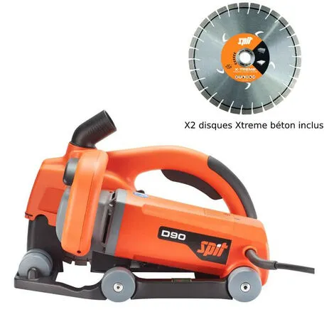 Rainureuse Spit D90. Cette rainureuse vous permet de réaliser des saignées sur supports de type béton, brique, parpaing ou tuile. Pratique, elle permet de travailler près des bords.